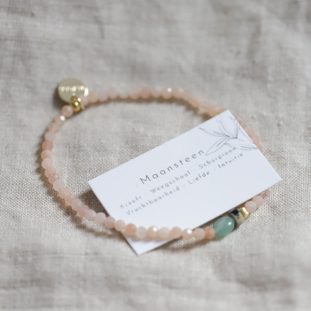 Binnen onze maansteen collectie nemen de maansteen armbandjes een speciale plaats in. Maansteen staat bekend om zijn zachte, iriserende glans en zijn diepe connectie met de maan en de vrouwelijke energie. Deze prachtige steen wordt geassocieerd met: