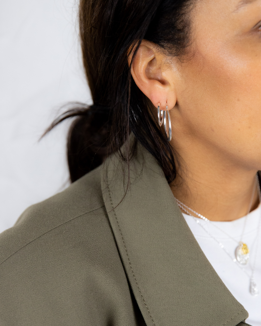 Een van de leukste aspecten van zilveren creolen is de mogelijkheid om ze te mixen en matchen. Combineer verschillende maten, stijlen en afwerkingen om je eigen unieke look te creëren. Als je meerdere gaatjes hebt kun je bijvoorbeeld een minimalistisch kleine stud combineren met een creool.